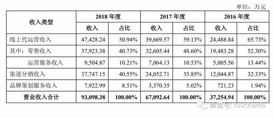 线上代运营是若羽臣的主要收入来源,其中,2018年来自线上代运营的收入为4.74亿元,占比为50.94%;