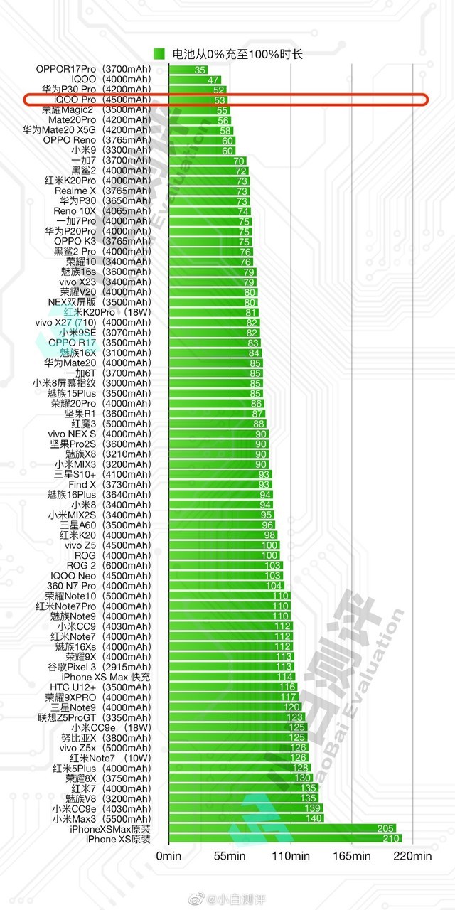 前不久,在网友小白测评公布的一组数据中我们可以看到,iQOO Pro这块4500mAh大电池的强悍,即便是面对高强度的应用以及5G网络高功耗的客观原因,电池续航表现依然出色,甚至比自家采用5000mAh电池的Z5x还要出色。而44W超快闪充则更加风驰电掣:息屏状态下,44W超快闪充可以将这块4500mAh大容量电池在17分钟内充到50%,30分钟充到80%,50分钟即可充至100%。
