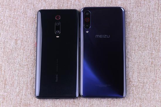 正面说完,我们再来看看机身背面,我们可以看到,魅族16T和红米K20 Pro都采用了后置三摄方案,但在摄像头排布上采用了不同的设计。魅族16T将后置三摄分布在了机身的左上角,呈“1”字排列。MEIZU logo位于机身中部,而红米K20 Pro的后置三摄分布在机身中部偏上,三摄排布类似于反向的感叹号,有着很高的辨识度。Redmi的logo与摄像头呈一条直线,整体机身背面高度对称。