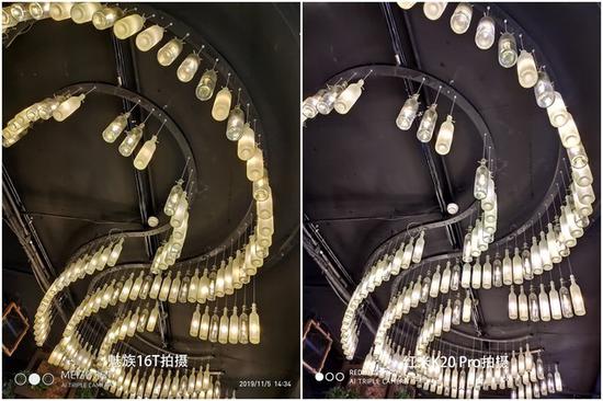 通过另一组夜拍对比,我们能够看到红米K20 Pro的夜拍能力还是“差点意思”,而且在夜晚拍摄偏色情况依旧严重。比如上图,偏暖色调的灯光,在红米K20 Pro的拍摄下,灯光已经变成了偏冷色调。
