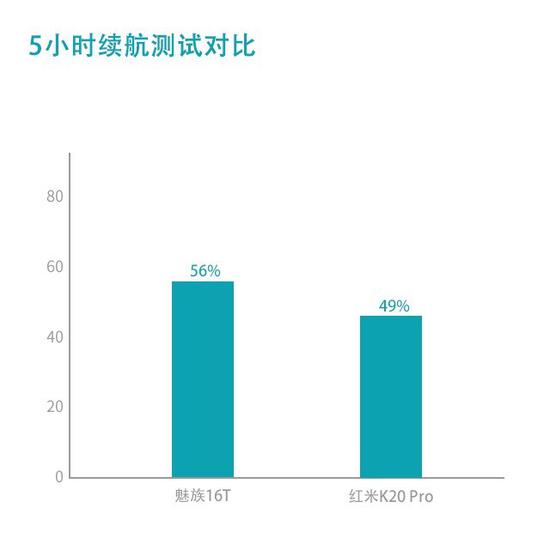 通过5小时的续航测试我们可以看到,果然不出所料,魅族16T的4500mAh大电池优势明显,经历了5小时续航测试之后还剩下了56%的电,而红米K20 Pro电量仅剩 49%。按照人们的日常使用习惯来看,魅族16T其实重度使用一天也能稳住电池电量,平常使用可以做到一天一充或者两天一充。