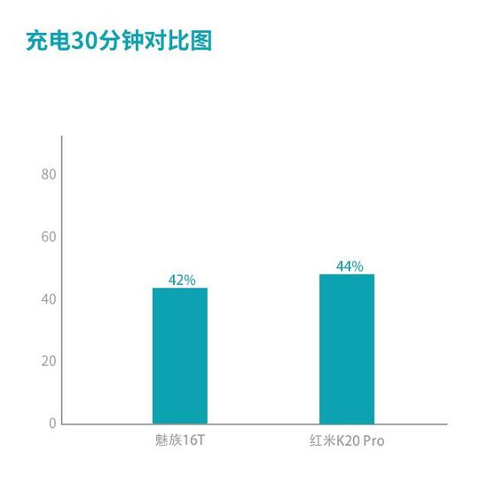 经过30分钟的充电测试,魅族16T充入电量42%,红米K20 Pro 充入44%的电量。不过考虑到魅族16T电池电量更大,所以两款手机的充电效率其实差距不大。