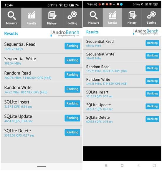 魅族16T(左)与红米K20 Pro(右)读写速度对比