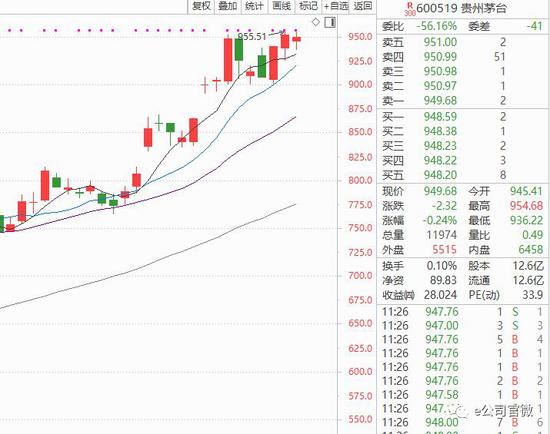 4月1日至今,贵州茅台累计涨幅已逾10%。就在昨日(4月17日)午后,白酒板块回暖,贵州茅台盘中上涨逾1.5%,每股报于955.51元,再创历史新高。