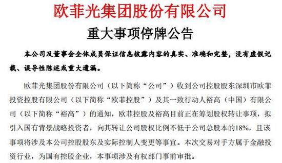 和两个月前一样,欧菲光也把希望寄托到了国有资本,4月29日午间,欧菲光午间公告称,收到公司控股股东欧菲控股及其一致行动人裕高的通知,欧菲控股及裕高目前正在筹划股权转让事项,拟引入国有背景战略投资者,向其转让公司股权比例不低于公司总股本的18%,且该事项将涉及本公司控股股东及实际控制人变更等事宜。