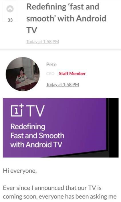 一加CEO刘作虎在一加社区海外版发文称,自从宣布将推出OnePlus TV以来,许多人都问我会使用什么操作系统,经过长时间的讨论和研究,我们决