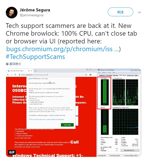 12月23日消息据BleepingComputer报道,安全研究人员Jérôme Segura日前在谷歌Chrome浏览器上发现了一个新的技术支持类欺诈,后者会通过JavaScript创建循环,导致Chrome的CPU占用率飙升并假死。