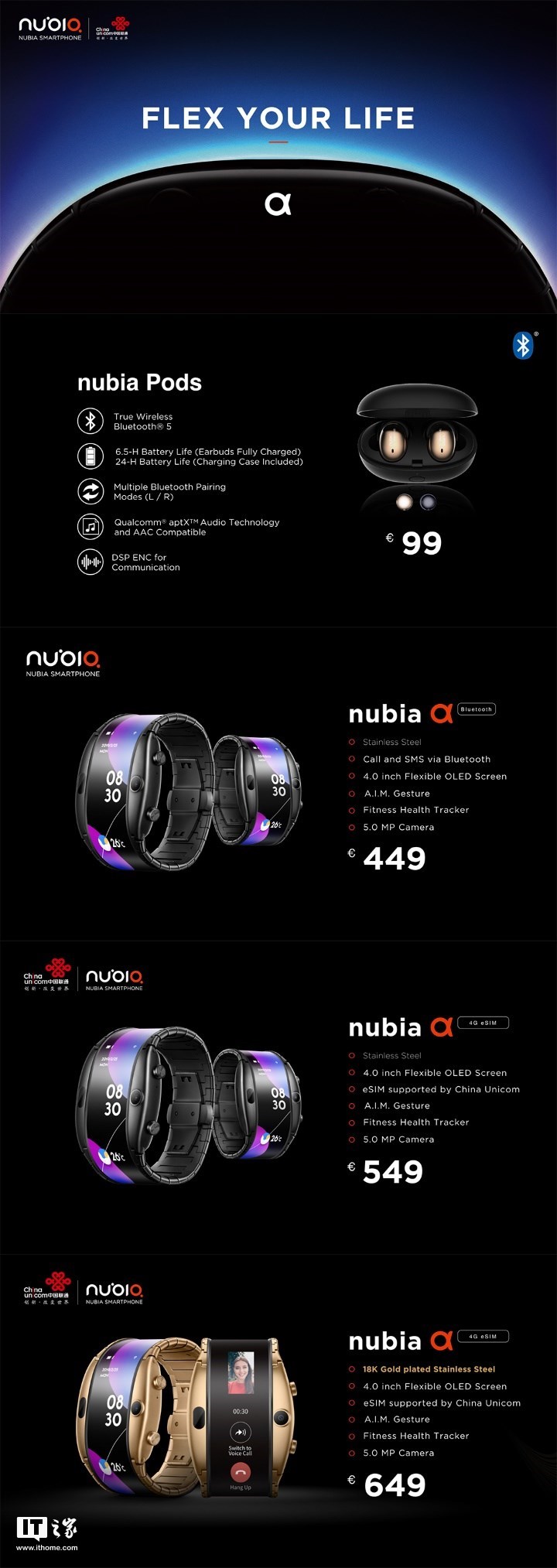 此外努比亚还为这款柔性屏腕机准备有蓝牙耳机配件——努比亚Pods,售价为99欧元。