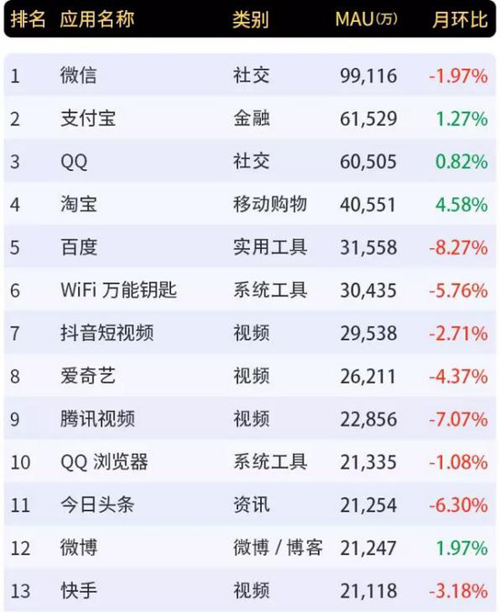 Trustdata大数据发布的2019年3月移动互联网全行业排行榜显示,目前腾讯系产品在社交领域中依然具有绝对的领先优势,排名前两位的社交App分别为微信与QQ,月活为9.9亿与6亿。
