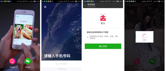 目前,“虾头App”最新版本为1.5.5,最新更新时间为2017年11月8日,不支持IOS系统。蓝鲸TMT记者测试发现,该软件设置了“手机登录”与“微信登录”两个登录入口,但登录后几乎都是闪退状态,并且“手机登录”未设置注册入口。