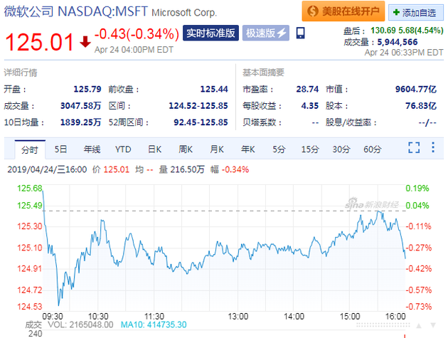 当日,微软股价在纳斯达克常规交易中下跌0.43美元,报收于125.01美元,跌幅为0.34%。在随后截止北京时间6:33分的盘后交易中,微软股价上涨5.68美元,至130.69美元,涨幅为4.54%。过去52周,微软的最高价为125.85美元,最低价为90.28美元。