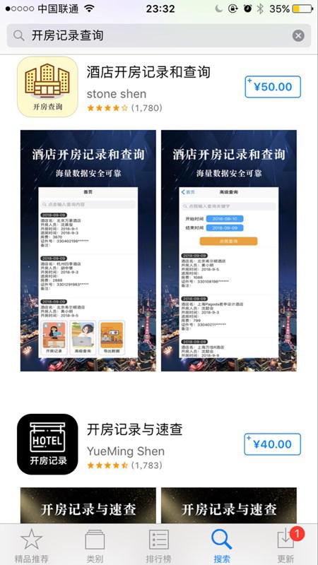 据多名网友反馈,目前苹果App Store商店内出现了多款付费的开房记录查询,价格50元、40元、30元不等,声称海量数据安全可靠关键字模糊查询
